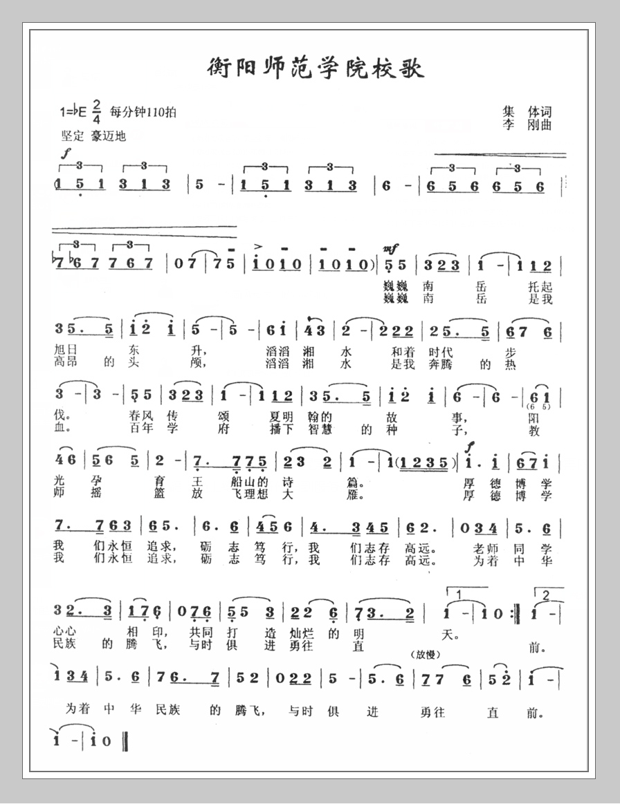 校歌歌曲为进行曲风格。全曲音乐分为两个部分。在激昂的前奏之后,第一部分热情而舒展,八度等大跳音程的运用,表现了南岳的雄伟和必赢官网师生良好的精神风貌;第二部分坚定有力的附点及切分节奏的运用讴歌了“校训”的精神,表现了师生面向美好未来的坚强决心。全曲昂扬向上,刚柔相济,旨在激励师生立志奋发,开创未来。
